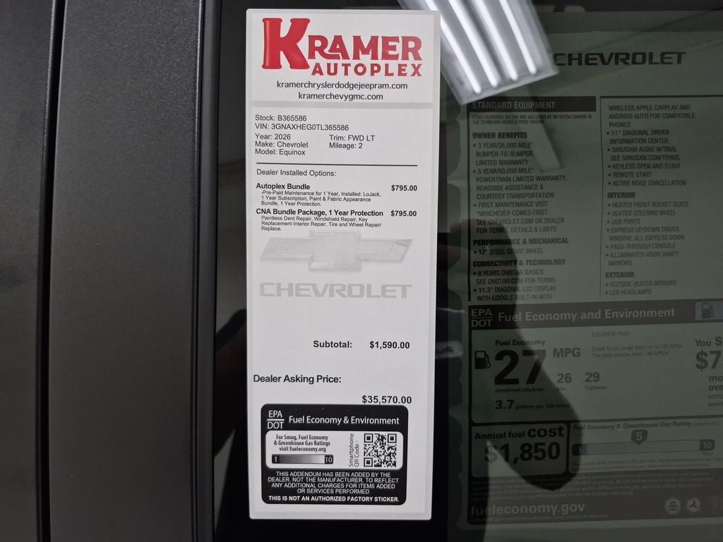 The rear parking assist technology on this unit will put you at ease when reversing. The system alerts you as you get closer to an obstruction. This unit's Lane Departure Warning keeps you safe by alerting you when you drift from your lane. Start this model from inside with remote start. This model stays safely in its lane with Lane Keep Assist. This 2026 Chevrolet Equinox features a hands-free Bluetooth® phone system. You'll never again be lost in a crowded city or a country region with the navigation system on this 2026 Chevrolet Equinox . This model has auto-adjust speed for safe following. Protect this mid-size suv from unwanted accidents with a cutting edge backup camera system. The Chevrolet Equinox is pure luxury with a heated steering wheel. This unit is outfitted with an OnStar communication system. This mid-size suv has a 4 Cyl, 1.5L high output engine. Front wheel drive on this model gives you better traction and better fuel economy.