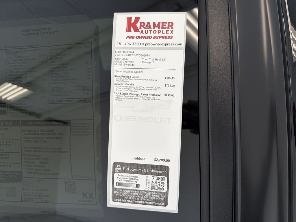 2026 Chevrolet Silverado 1500 LT Trail Boss 4WD with V8 5.3L gasoline — located in Livingston, TX — delivers power, capability, and comfort at the best price. This rugged Trail Boss edition pairs a proven 5.3L V8 with intelligent 4WD for confident towing, hauling, and off-road adventures while maintaining modern on-road refinement. Bold exterior styling and a high-performance suspension make every drive look and feel purposeful. Inside, premium features elevate daily driving: Automatic Climate Control keeps the cabin comfortable in Texas heat, while a Heated Steering Wheel adds cozy convenience on cooler mornings. Safety-focused technologies include Lane Departure Warning and Lane Keep Assist to help you stay centered and confident on long highway stretches. Seamless smartphone integration is provided through Android Auto, keeping navigation, music, and communication at your fingertips. This Chevrolet Silverado LT Trail Boss comes loaded with capability-focused details—aggressive stance, durable bed features, and trail-ready components—perfect for work sites or weekend escapes. With proven Chevrolet durability and a V8 that offers responsive acceleration and solid towing capacity, this truck is engineered for drivers who demand both strength and sophistication. Conveniently located in Livingston, TX, this 2026 Chevrolet Silverado 1500 LT Trail Boss is priced to sell and represents the best value in the area. Schedule a test drive today to feel the power, comfort, and advanced safety features that set this Trail Boss apart.