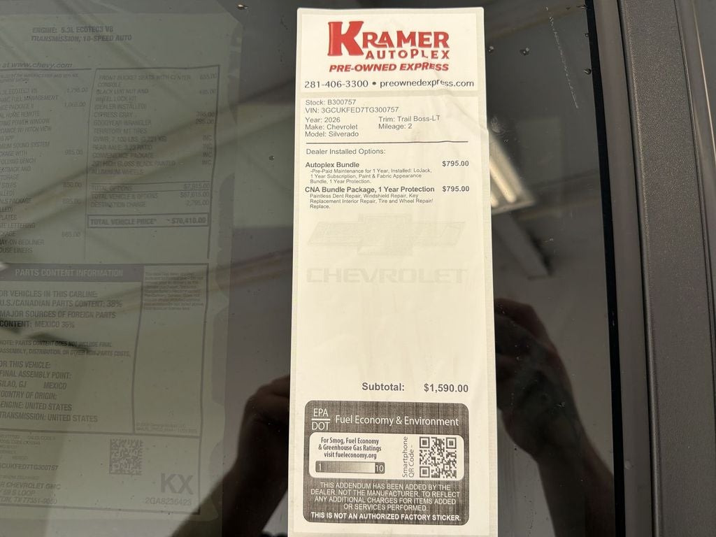 Discover the 2026 Chevrolet Silverado 1500 LT Trail Boss in Livingston, TX — a bold, capable 4WD truck powered by a V8 5.3L gasoline engine that delivers the power, efficiency, and towing confidence you need. This Trail Boss pairs rugged off-road capability with premium tech and comfort features, making it the perfect choice for work, weekend adventures, and everything in between. Priced to be the best value in the area, this Chevrolet Silverado 1500 LT Trail Boss offers exceptional performance without compromising on luxury. Step inside to enjoy a premium BOSE stereo system and XM Radio for crisp audio on every drive. Stay connected and in control with Steering Wheel Audio Controls and Remote Start for convenience and comfort before you even get in. Advanced safety features like Lane Departure Warning help keep you and your passengers secure on long hauls or daily commutes. This Chevrolet Silverado 1500 LT Trail Boss stands out with aggressive Trail Boss styling, a rugged suspension, and 4WD capability to tackle rough terrain or slick roads. The V8 5.3L engine provides the dependable power and torque needed for towing and hauling, while modern interior amenities ensure a comfortable ride. Located in Livingston, TX, this Chevrolet Silverado is competitively priced to move quickly — the best price in the market for this model. Contact us today to schedule a test drive and experience the perfect blend of power, technology, and value in this 2026 Chevrolet Silverado 1500 LT Trail Boss.