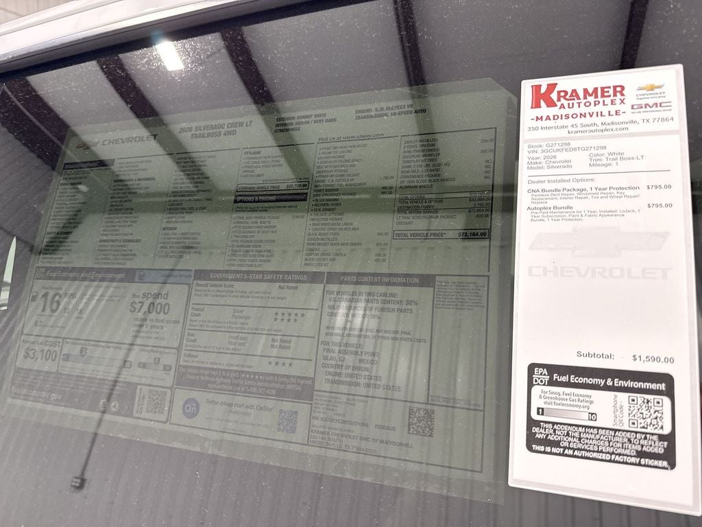 2026 Chevrolet Silverado 1500 LT Trail Boss 4WD — V8, 5.3L Gasoline — Madisonville, TX Drive home in a bold, capable 2026 Chevrolet Silverado 1500 LT Trail Boss with 4WD and a powerful V8 5.3L gasoline engine. This Trail Boss is engineered for worksite performance and weekend adventure, featuring a robust suspension, aggressive styling, and off-road-ready capability without sacrificing everyday comfort. Located in Madisonville, TX, this Chevrolet Silverado is priced to move — the best price available locally for comparable condition and features. Key safety and convenience tech include Lane Keep Assist and Lane Departure Warning to help reduce driver fatigue and increase highway confidence. Stay connected and entertained via Hands-Free Bluetooth® and Apple CarPlay integration, while Automatic Climate Control maintains a comfortable cabin environment on hot Texas days. The interior balances rugged utility with modern amenities for towing, hauling, and long-distance travel. Whether you need reliable towing capacity, off-road competence, or a truck with advanced driver aids, this 2026 Chevrolet Silverado 1500 LT Trail Boss delivers exceptional value. Visit Madisonville, TX to test drive and compare — you won't find a better price for this combination of V8 power, 4WD capability, and advanced features. Schedule your appointment today and experience Trail Boss performance firsthand.