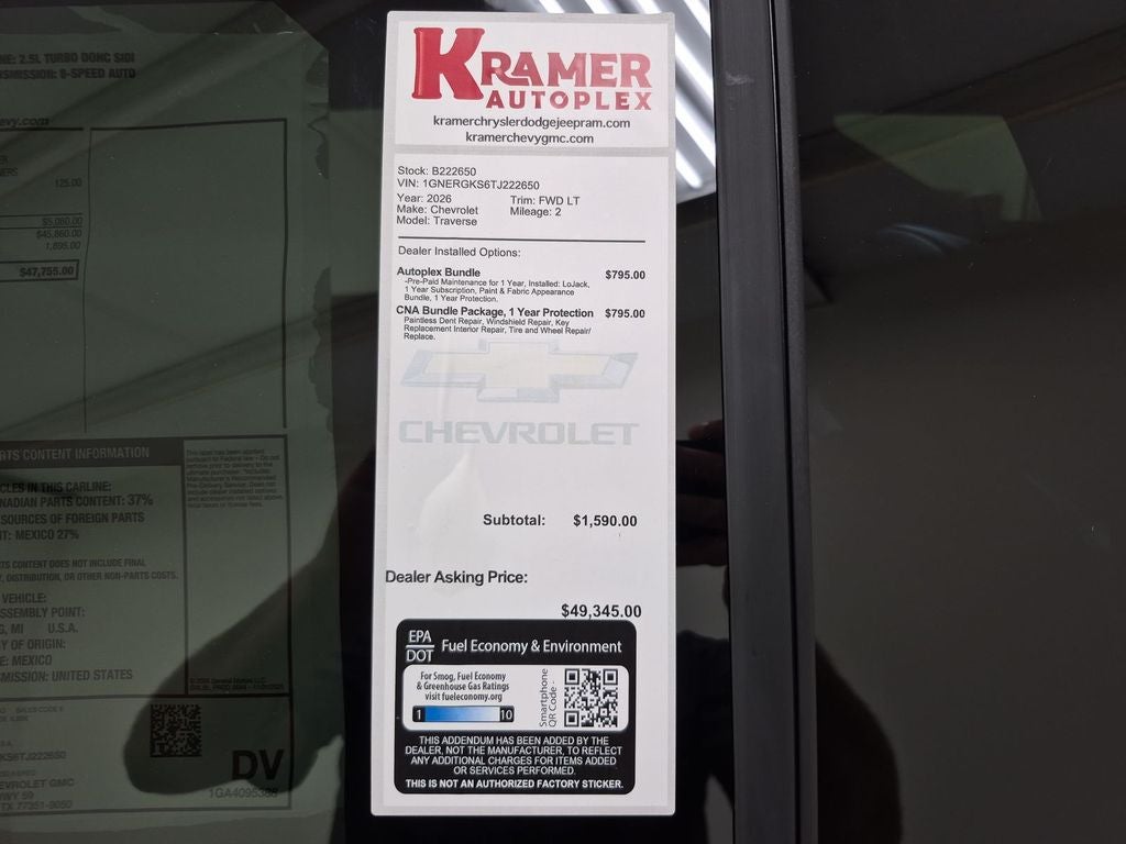 This 1/2 ton suv has auto-adjust speed for safe following. Apple CarPlay: Seamless smartphone integration for this 2026 Chevrolet Traverse - stay connected and entertained on the go! The Chevrolet Traverse features a hands-free Bluetooth® phone system. This 2026 Chevrolet Traverse offers Android Auto for seamless smartphone integration. Lane Keep Assist in the vehicle helps maintain safe driving by gently steering to stay within the lane. The vehicle is pure luxury with a heated steering wheel. Protect this vehicle from unwanted accidents with a cutting edge backup camera system. The installed navigation system will keep you on the right path. Start the Chevrolet Traverse from inside with remote start. This model has a 4 Cyl, 2.5L high output engine. It is outfitted with an OnStar communication system. Front wheel drive on the Chevrolet Traverse gives you better traction and better fuel economy. Set the temperature exactly where you are most comfortable in it. The fan speed and temperature will automatically adjust to maintain your preferred zone climate.