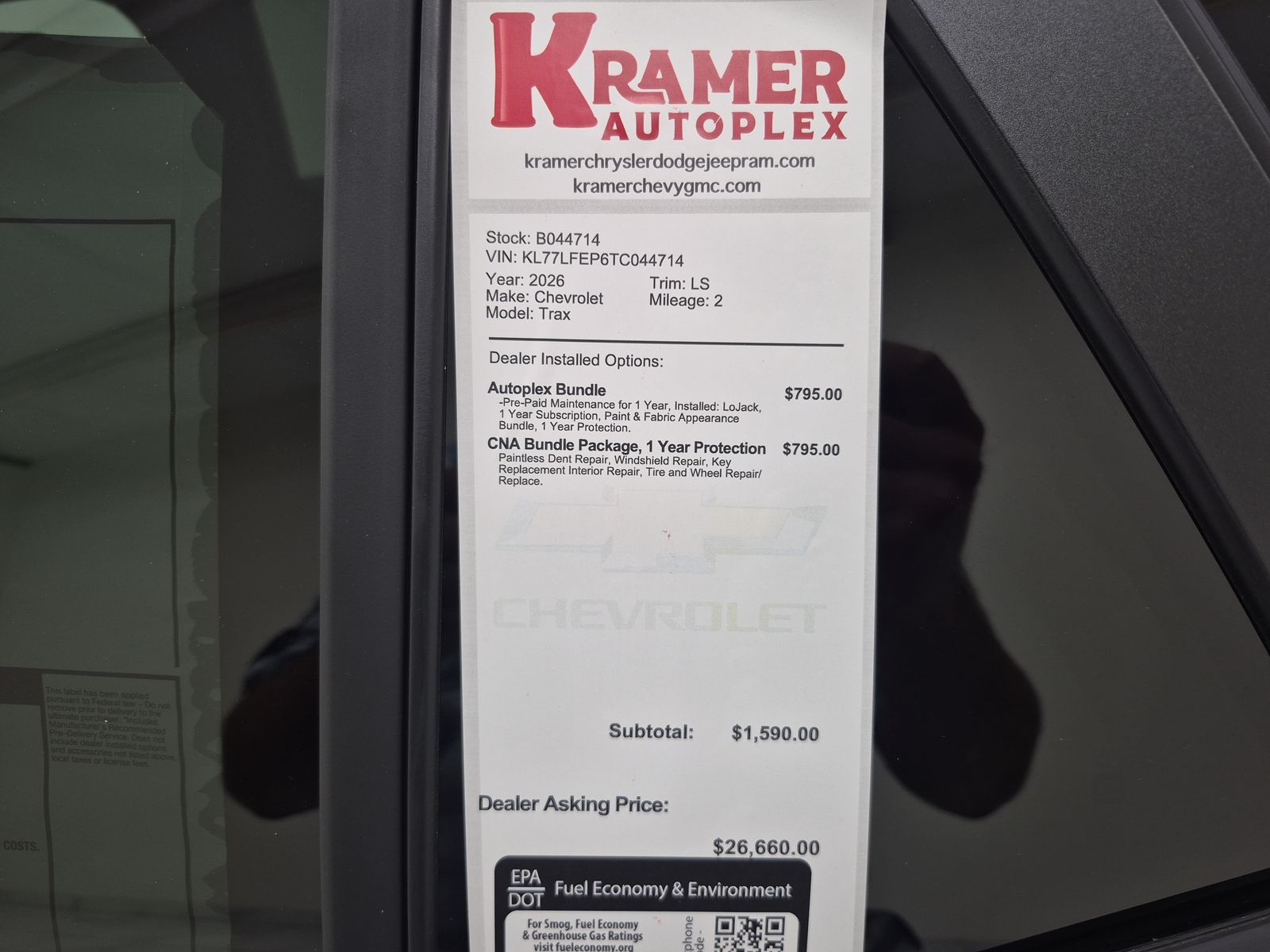 2026 Chevrolet Trax LS — FWD, 3‑Cyl 1.2L Gasoline — Located in Livingston, TX Find exceptional value with this 2026 Chevrolet Trax LS, a compact crossover that pairs efficient performance with modern safety and convenience features. Powered by a fuel-sipping 3‑cylinder 1.2L gasoline engine and front‑wheel drive, the Chevrolet Trax LS delivers confident handling around town and on highway commutes while optimizing fuel economy for daily driving. Equipped with advanced driver assistance systems, this Chevrolet Trax includes Lane Keep Assist and Lane Departure Warning to help maintain safe lane positioning during longer trips. A Back‑Up Camera enhances visibility while reversing, making parking and tight maneuvers easier. Enjoy modern connectivity with Hands Free Bluetooth® for calls and audio streaming, and start your vehicle remotely with Remote Start for comfort on hot or cool Texas mornings. The Chevrolet Trax LS features a spacious, versatile interior for passengers and cargo, thoughtful storage solutions, and intuitive controls designed for everyday convenience. With a compact footprint, it's ideal for urban driving yet roomy enough for weekend getaways and errands. Located in Livingston, TX, this 2026 Chevrolet Trax LS is offered at the best price in the area, providing outstanding value compared to similar models. Contact us today to schedule a test drive and experience the combination of efficiency, safety, and smart features this Chevrolet Trax brings to your daily drive.