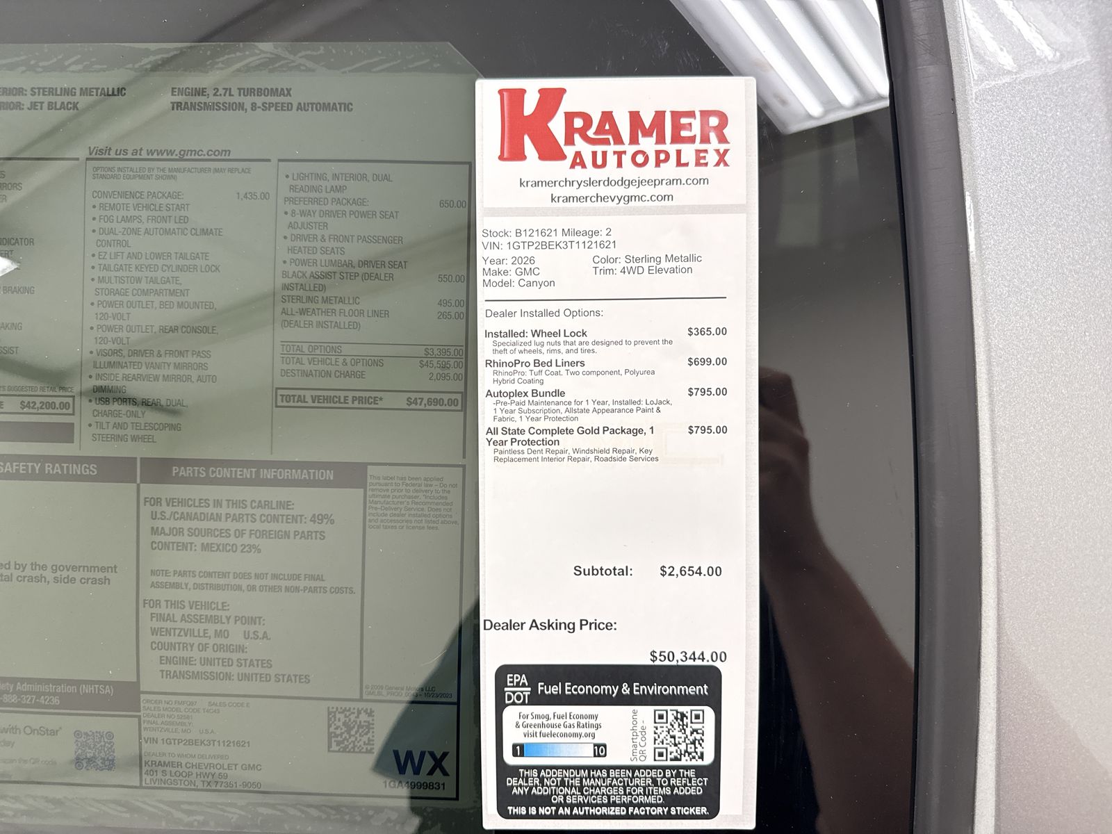 Convenience Package: 120-Volt Bed Mounted Power Outlet; Interior Overhead Courtesy Light with Dual Reading Lamp; EZ-Lift and Lower Tailgate; Remote Vehicle Starter System; Driver and Front Passenger Illuminated Visors; Dual-Zone Automatic Climate Control Air Conditioning; Front LED Fog Lamps; Tailgate Keyed Cylinder Lock; Til and Telescopic Manual Steering Column; MultiStow Tailgate Storage Compartment; Rear of Console 120-Volt Power Outlet; Inside Rearview Auto-Dimming Mirror; 2 Rear USB Ports in Center Console (charge-Only). Preferred Equipment Group 4VL: Canyon Pro Safety; Canyon Safety Plus Package. Preferred Package: 8-Way Power Driver Seat Adjuster; Heated Driver and Front Passenger Seats; Power Driver Lumbar Control Seat Adjuster. Black Assist Steps. Sterling Metallic. 1st and 2nd Rows All-Weather Floor Liner. Front License Plate Kit. **Equipment listed is based on original vehicle build and subject to change. Please confirm the accuracy of the included equipment by calling the dealer prior to purchase.**