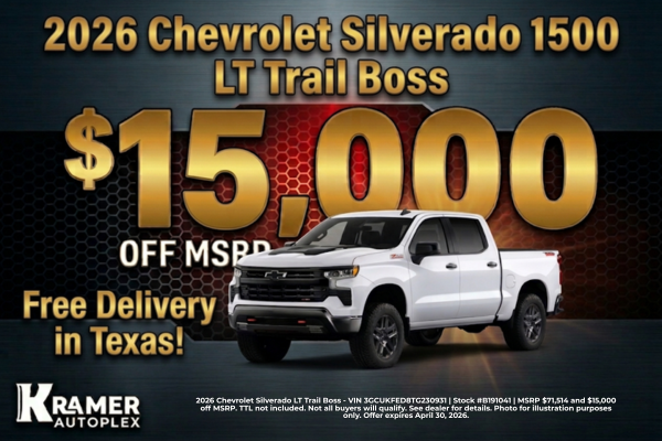 Drive home the powerful 2026 Chevrolet Silverado 1500 LT Trail Boss and take advantage of an incredible $15,000 off MSRP. Built for performance and off-road capability, this truck delivers strength, style, and value all in one. Plus, enjoy the added convenience of free delivery anywhere in Texas, making it easier than ever to get behind the wheel. See dealer for additional details.