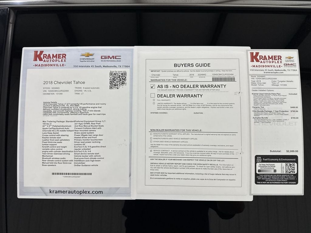 This Chevrolet Tahoe is located in Madisonville, TX, and is priced to sell — offering the best price compared to similar local listings. Whether you need a reliable commuter, weekend adventurer, or capable family hauler, this 2018 Chevrolet Tahoe LT balances power, technology, and comfort at an exceptional value. Schedule a test drive today to experience the V8 performance and feature-rich cabin in person. Competitive pricing and a great selection make this Chevrolet Tahoe the smart choice in the Madisonville area.