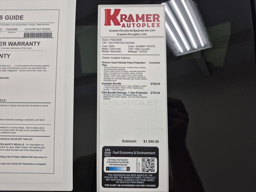 Interior Convenience Package: Console Insert Organizer Tray; 1st and 2nd Row All-Weather Floor Liners; Underseat Storage. Safety Package II: Forward Collision Alert; Following Distance Indicator; Automatic Emergency Braking; Safety Alert Seat; IntelliBeam Automatic High Beam On/off; Lane Departure Warning. Technology Package: HD Surround Vision with 2 Trailer View Camera Provisions; 15" Diagonal Multicolor Head-Up Display; Bed View Camera; Rear Camera Mirror. High Country Deluxe. Preferred Equipment Group 3LZ: Driver Memory; Perforated Leather-Appointed Seat Trim; SiriusXM with 360L; Power Sliding Rear Window with Defogger; Ultrasonic Front and Rear Park Assist; Electric Rear-Window Defogger; Unauthorized Entry Theft-Deterrent System; Heated Steering Wheel; 120-Volt Instrument Panel Power Outlet; Heated Driver and Front Outboard Passenger Seating; Wireless Charging; Front Bucket Seats with Center Console; Color-Keyed Carpeting Floor Covering; OnStar and Chevrolet Connected Services Capable; 8" Diagonal Multicolor Digital Display DIC; Heated 2