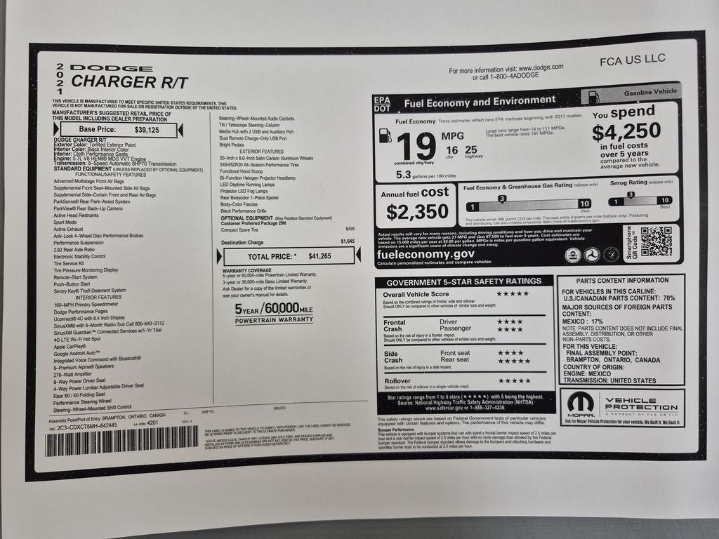 Never get into a cold vehicle again with the remote start feature on this model. This vehicle is a certified CARFAX 1-owner. The vehicle has a clean CARFAX vehicle history report. The vehicle keeps you comfortable with Auto Climate. See what's behind you with the back up camera on this vehicle. This large car is equipped with the latest generation of XM/Sirius Radio. The Dodge Charger features a hands-free Bluetooth® phone system. The rear parking assist technology on this 2021 Dodge Charger will put you at ease when reversing. The system alerts you as you get closer to an obstruction. It offers Apple CarPlay for seamless connectivity. The vehicle offers Android Auto for seamless smartphone integration. The vehicle has a V8, 5.7L high output engine. Quickly unlock this unit with keyless entry. This model gleams with a flashy red exterior. Maintaining a stable interior temperature in it is easy with the climate control system.