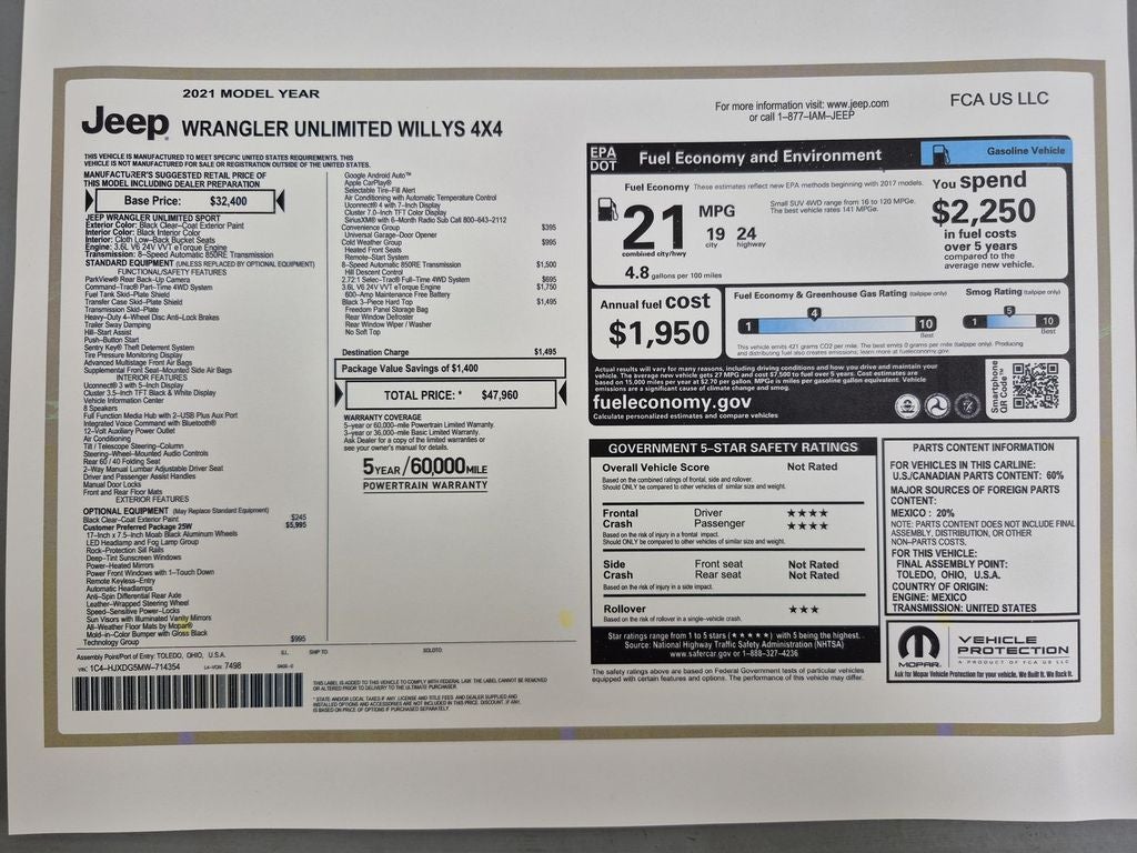 This mid-size suv has satellite radio capabilities. This vehicle is a certified CARFAX 1-owner. It keeps you comfortable with Auto Climate. Never get into a cold vehicle again with the remote start feature on this 2021 Jeep Wrangler . Keep your hands warm all winter with a heated steering wheel in the Jeep Wrangler . The Jeep Wrangler comes equipped with Android Auto for seamless smartphone integration on the road. Apple CarPlay: Seamless smartphone integration for it - stay connected and entertained on the go! with XM/Sirus Satellite Radio you are no longer restricted by poor quality local radio stations while driving this Jeep Wrangler. Anywhere on the planet, you will have hundreds of digital stations to choose from. Protect this Jeep Wrangler from unwanted accidents with a cutting edge backup camera system. Bluetooth® technology is built into this mid-size suv, keeping your hands on the steering wheel and your focus on the road.