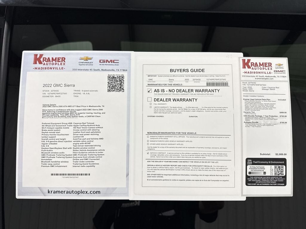Preferred Equipment Group 4SB: HD Rear Vision Camera; LED Cargo Area Lighting; Remote Vehicle Starter System; 2 USB Ports (1st Row); Electric Rear-Window Defogger; Wireless Phone Projection; Floor-Mounted Center Console; Unauthorized Entry Theft-Deterrent System; Painted Black Surround Grille; Compass Located in Instrument Cluster; 4.2" Diagonal Color Display Driver Info Center; Electrical Lock Control Steering Column; 120-Volt Instrument Panel Power Outlet; Heated Driver and Front Outboard Passenger Seats; X31 Off-Road Package; Front Premium Floor Liners with Removable Carpet Insert; Steering Wheel Audio Controls; Rear Premium Floor Liners with Removable Carpet Insert; OnStar and GMC Connected Services Capable; 120-Volt Bed Mounted Power Outlet; Power Front Passenger Windows with Express Up/down; 2-Speed Active Transfer Case; Deep-Tinted Glass; 6.6L V8 with Direct Injection and Variable Valve Timing Engine; Spray-On Pickup Box Bed Liner with AT4 Logo; AM/FM Stereo with Premium GMC Infotainment System; Power Rear Windows with Express Down; Red Recovery Hooks; Integrated Trailer Brake Controller; Power Windows with Driver Express Up/down; Heated and Ventilated Front Bucket Seats; Manual Tilt-Wheel/telescoping Steering Column; 2nd Row Dual USB Charge-Only Ports; Keyless Open and Start; ProGrade Trailering System; Rear Wheelhouse Liners; 12-Volt Rear Auxiliary Power Outlet; 2 USB Ports; Power Door Locks. Cayenne Red Tintcoat. 5th Wheel and Gooseneck Trailer Wiring Provisions. **Equipment listed is based on original vehicle build and subject to change. Please confirm the accuracy of the included equipment by calling the dealer prior to purchase.**
