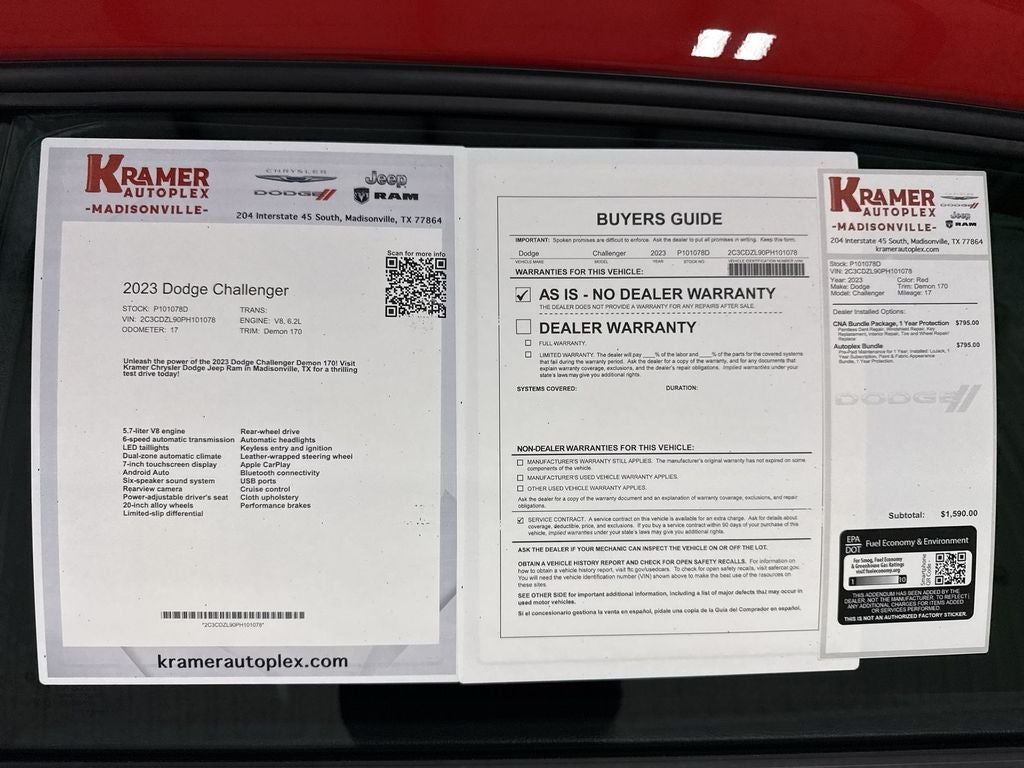 Quick Order Package 27Q Redeye Widebody. SRT Demon 170: 3.09 Rear Axle Ratio; SiriusXM Radio Service; 240 Mm Rear Axle; 245/55R18 Front and P315/50R17 Rear Tires; SRT Performance Spoiler; Mickey Thompson Brand Tires; SRT Demon 170 Exterior Badging; 1 Year NMCA/NHRA Membership; For More Info. Call 800-643-2112; DC Illuminated Air Catcher Headlamps; 18" X 8" Front and 17" X 11" Rear Forged Aluminum Wheel; Delete Trunk Carpet; Transbrake; 170 Drag Suspension; Delete Sound Insulation; Black Brake Calipers; 4-Piston Brakes with Yellow Logo; Air-Grabber Hood; SiriusXM Satellite Radio; Satin Black Dodge Tail Lamp Badge; Rear Body Flares; SRT Demon 170 IP Badge; High Intensity Discharge Headlamps; 2-Speaker Minimal Audio; Exterior Plastics Module; Red LED Alcantara Steering Wheel; Delete Trunk Lamp and Bright Pedals; Real Carbon Fiber Interior Accents; Flex Fuel Vehicle. Gas Guzzler Tax. 3.09 Rear Axle Ratio. Real Carbon Fiber Interior Accents. Black Brake Calipers. Demonic Red Seat Belts. Red LED Alcantara Steering Wheel. **Equipment listed is based on original vehicle build and subject to change. Please confirm the accuracy of the included equipment by calling the dealer prior to purchase.**