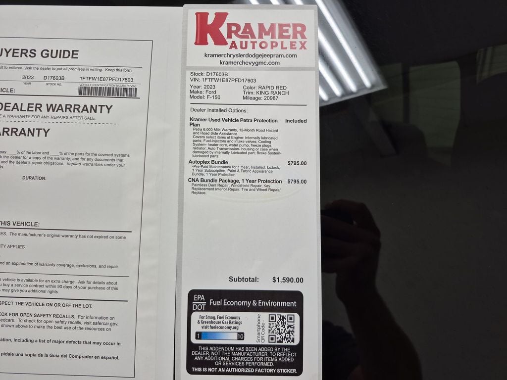 The leather seats in this Ford F-150 are a must for buyers looking for comfort, durability, and style. This vehicle is pure luxury with a heated steering wheel. The Ford F-150 offers Android Auto for seamless smartphone integration. The vehicle features a hands-free Bluetooth® phone system. This model has a clean CARFAX vehicle history report. This vehicle is a certified CARFAX 1-owner. An off-road package is installed on this 1/2 ton pickup so you are ready for your four-wheeling best. The Ford F-150 has automated speed control that adjusts to maintain a safe following distance, enhancing highway driving convenience. See what's behind you with the back up camera on this 2023 Ford F-150 . Start this Ford F-150 from inside with remote start. This vehicle offers Apple CarPlay for seamless connectivity. You'll never again be lost in a crowded city or a country region with the navigation system on it.