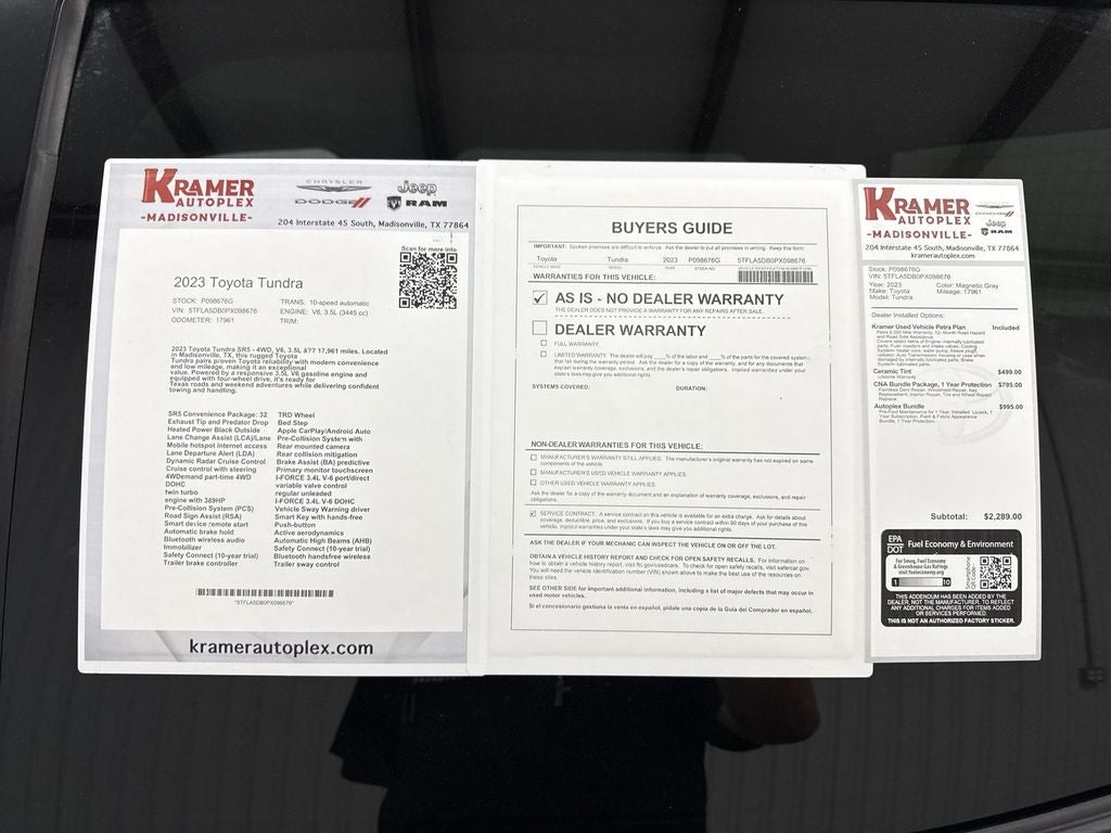 Discover the perfect blend of capability and value with this 2023 Toyota Tundra SR5, located in Madisonville, TX. With just 17,962 miles, this low-mileage Toyota Tundra is ready to tackle worksite duties, weekend adventures, and daily drives. Powered by a robust V6 3.5L (3445 cc) gasoline engine and equipped with confident 4WD, this truck delivers excellent towing and off-road capability while maintaining Toyota reliability.