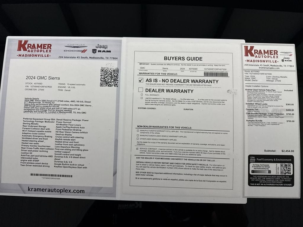 2024 GMC Sierra 3500 Denali — 27549 miles, 4WD, V8 6.6L Diesel — Madisonville, TX Ready for heavy-duty performance with refined comfort, this 2024 GMC Sierra 3500 Denali pairs a powerful V8 6.6L Diesel with four-wheel drive and just 27,549 miles — an exceptional low-mileage find for anyone needing capability and longevity. Located in Madisonville, TX, this GMC Sierra Denali delivers premium towing and hauling with the durability diesel owners demand while maintaining the upscale features Denali buyers expect. Premium tech and convenience include Android Auto, Hands-Free Bluetooth®, and a Heated Steering Wheel for cold mornings. Safety and driver assistance come courtesy of Adaptive Cruise Control, helping reduce fatigue on long drives. This unit is CARFAX 1-Owner, offering added confidence in its history and condition. We're offering this GMC Sierra 3500 Denali at the best price in the area — a rare combination of top-tier capability, low mileage, single-owner history, and premium features. Whether you need a workhorse for jobsite duty or a comfortable long-haul companion, this truck is priced to move and ready to perform. Contact us in Madisonville, TX to schedule a test drive and see why this 2024 GMC Sierra 3500 Denali represents outstanding value and capability at a competitive price.